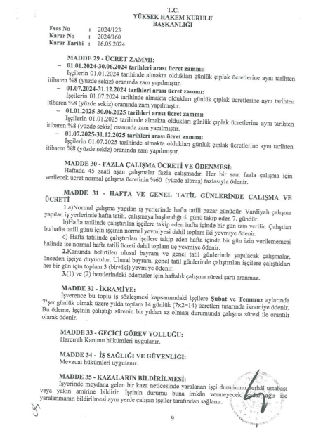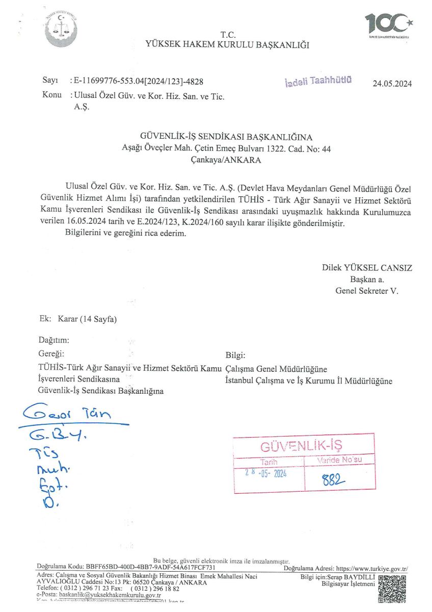 Ulusal Özel Güv. ve Kor. Hiz. San. ve Tic. A.Ş. (Devlet Hava Meydanları Genel Müdürlüğü) ile tarafından yetkilendirilen TÜHİS-Türk Ağır Sanayii ve Hizmet Sektörü Kamu İşverenleri Sendikası ile Güvenlik ve Savunma İşçileri Sendikası (GÜVENLİK-İŞ) arasındaki Toplu İş Sözleşmesi Görüşmeleri Yüksek Hakem Kurulunca Karara Bağlanmıştır.