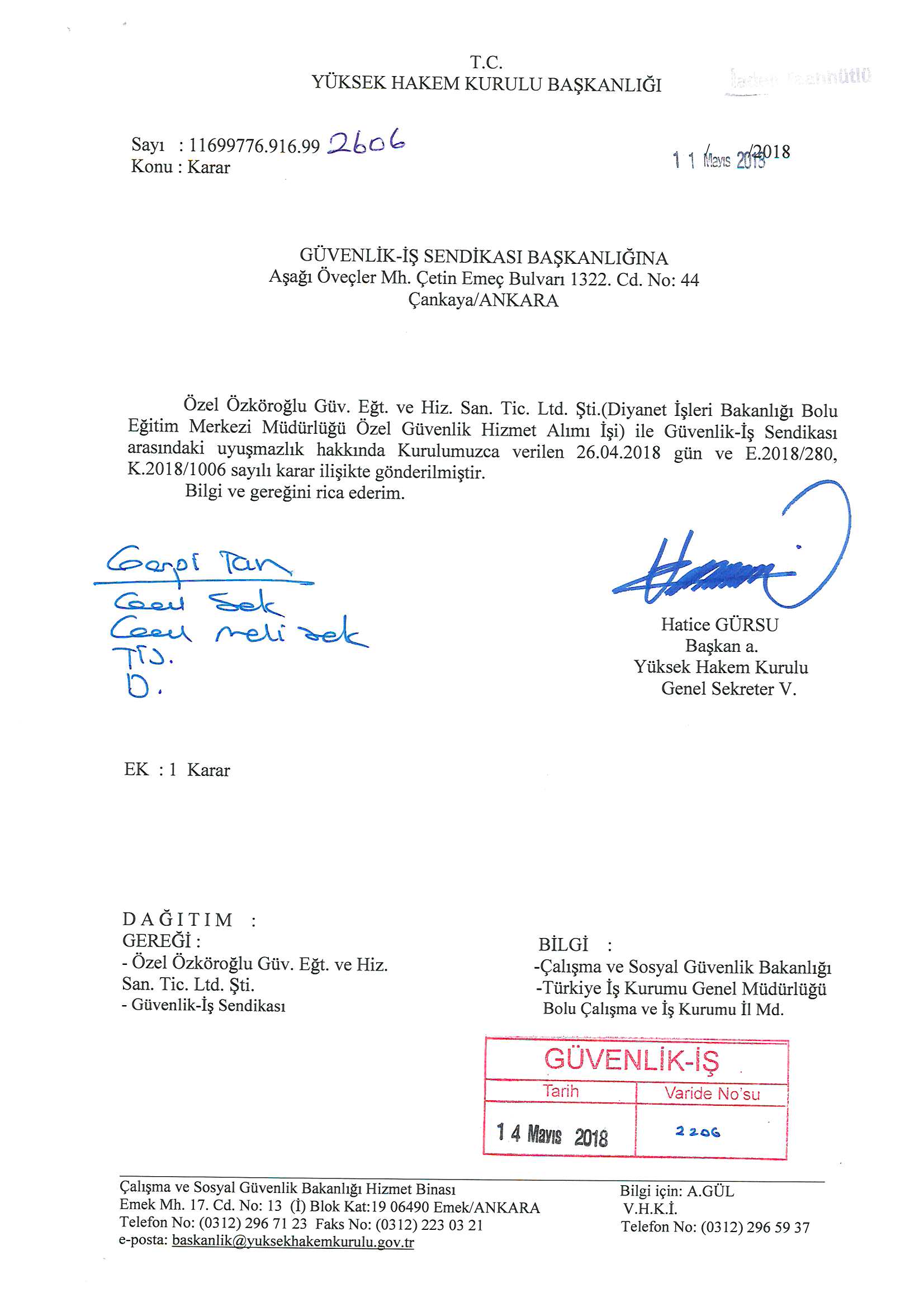 Güvenlik ve Savunma İşçileri Sendikası (GÜVENLİK-İŞ) – Özel Özköroğlu Güvenlik Eğt. ve Hiz. San. Tic. Ltd. Şti. (Diyanet İşleri Başkanlığı Bolu Eğitim Merkezi Müdürlüğü Özel Güvenlik Hizmet Alımı İşi) arasındaki Toplu İş Sözleşmesi Görüşmeleri Yüksek Hakem Kurulunca Karara Bağlanmıştır.