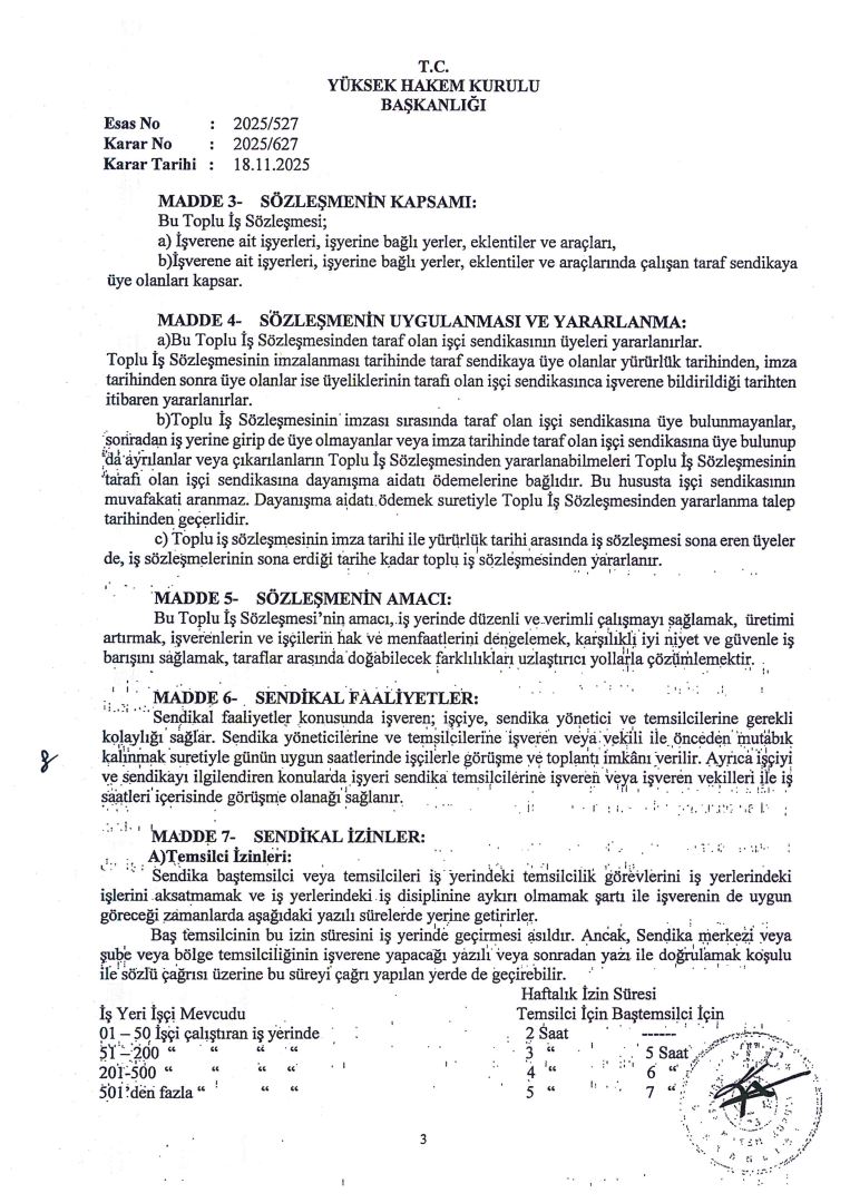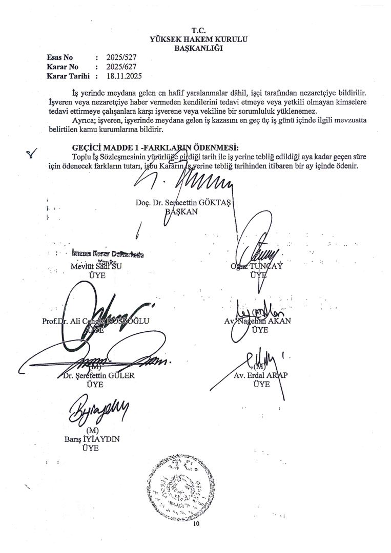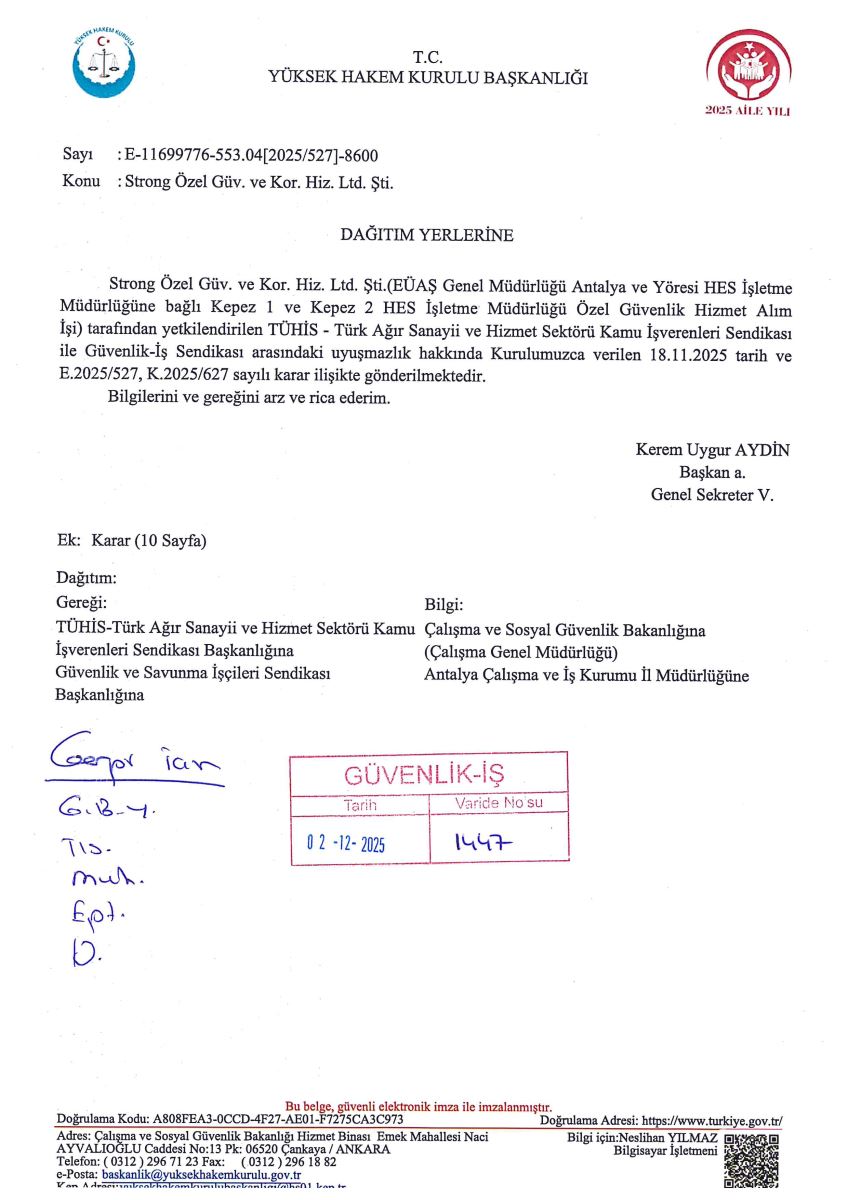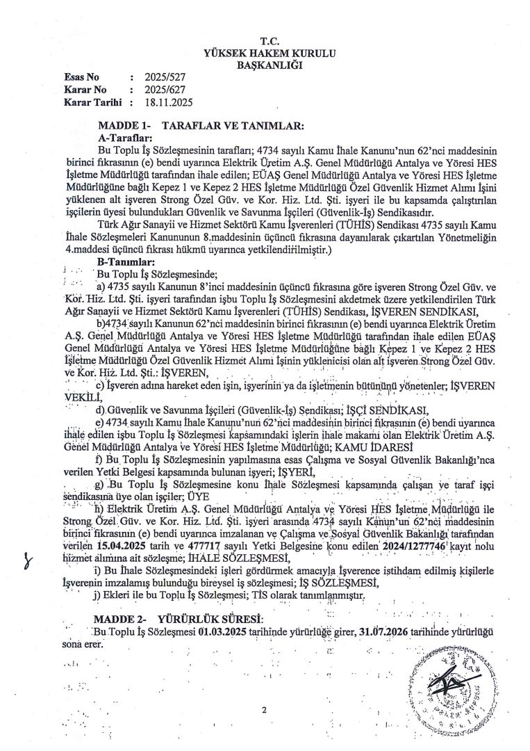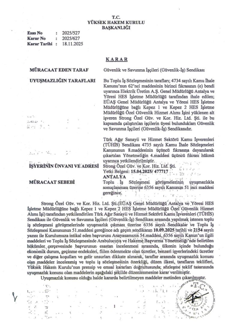 Strong Özel Güv. ve Kor. Hiz. Ltd. Şti. (EÜAŞ Genel Müdürlüğü Antalya ve Yöresi HES İşletme Müdürlüğüne bağlı Kepez 1 ve Kepez 2 HES İşletme Müdürlüğü) ile tarafından yetkilendirilen TÜHİS-Türk Ağır Sanayii ve Hizmet Sektörü Kamu İşverenleri Sendikası ile Güvenlik ve Savunma İşçileri Sendikası (GÜVENLİK-İŞ) arasındaki Toplu İş Sözleşmesi Görüşmeleri Yüksek Hakem Kurulunca Karara Bağlanmıştır.