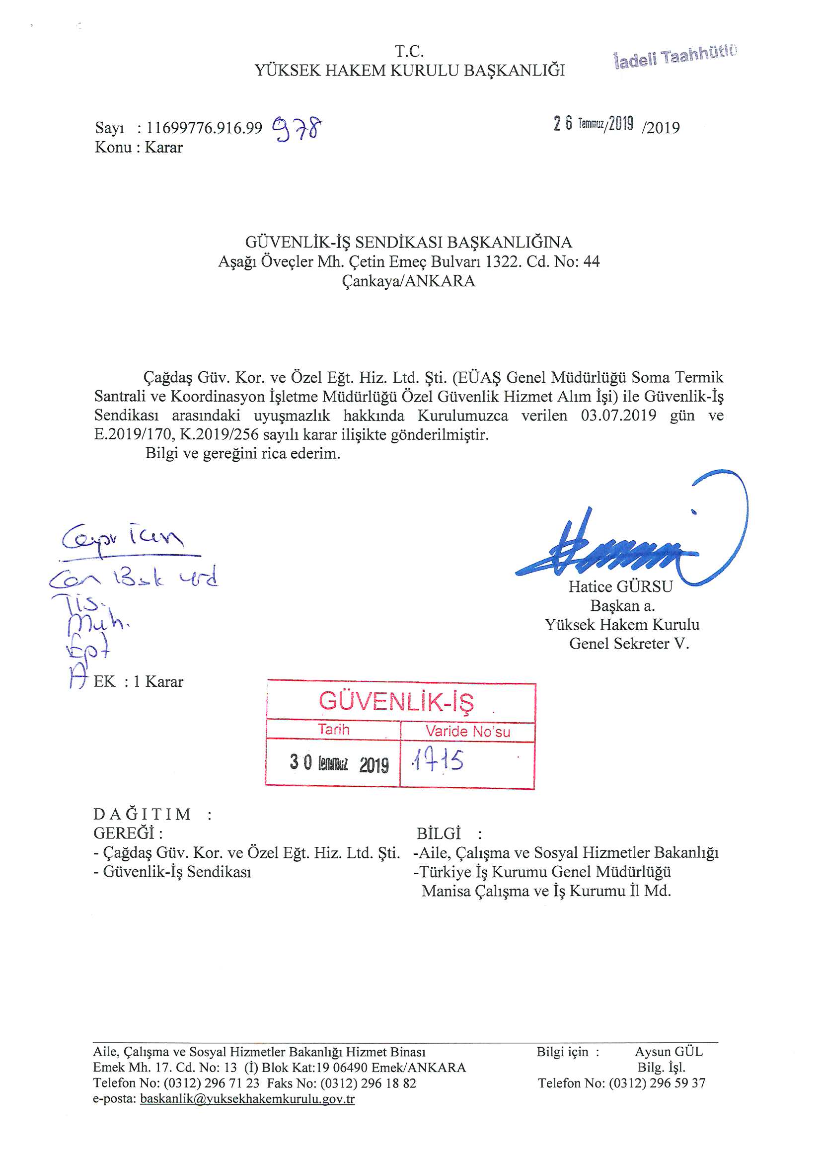 Çağdaş Güv. Kor. ve Özel Eğt. Hiz. Ltd. Şti. (EÜAŞ Genel Müdürlüğü Soma Termik Santrali ve Koordinasyon İşletme Müdürlüğü) ile Güvenlik ve Savunma İşçileri Sendikası (GÜVENLİK-İŞ) – arasındaki Toplu İş Sözleşmesi Görüşmeleri Yüksek Hakem Kurulunca Karara Bağlanmıştır.