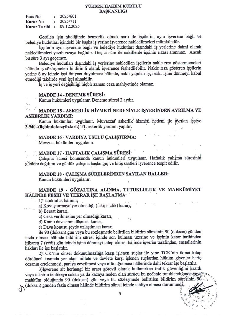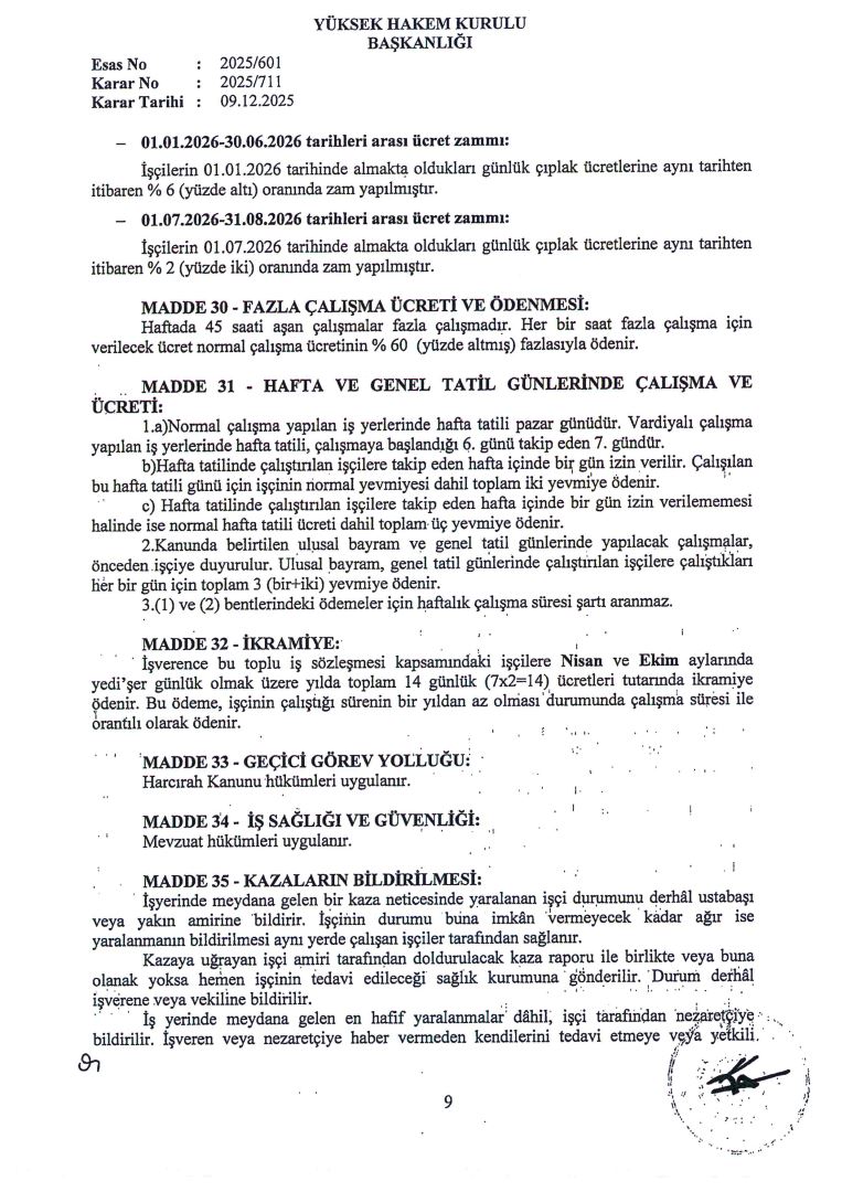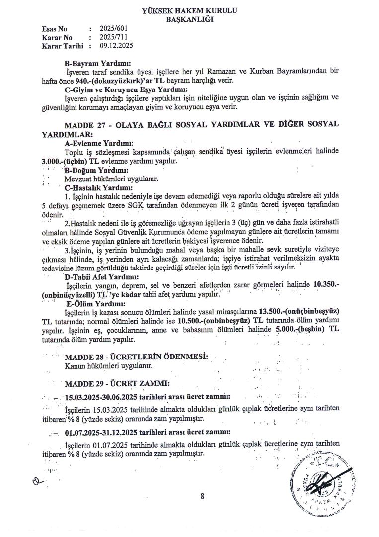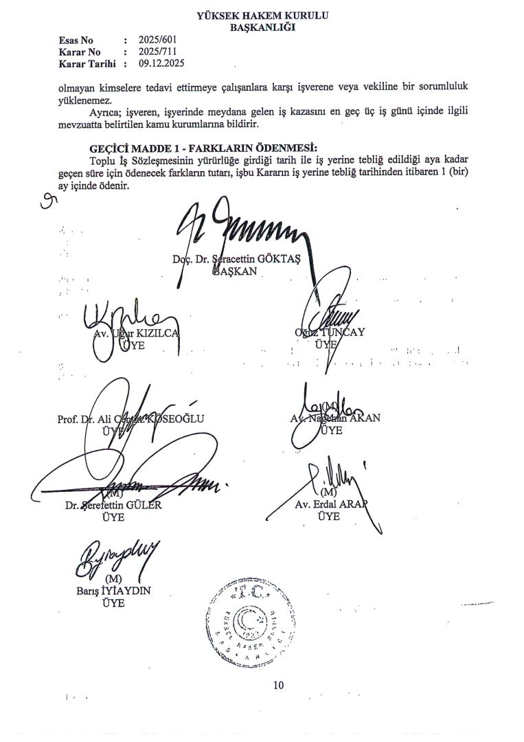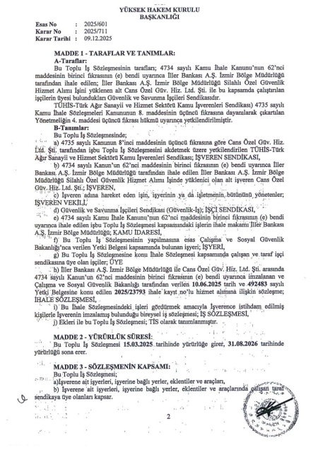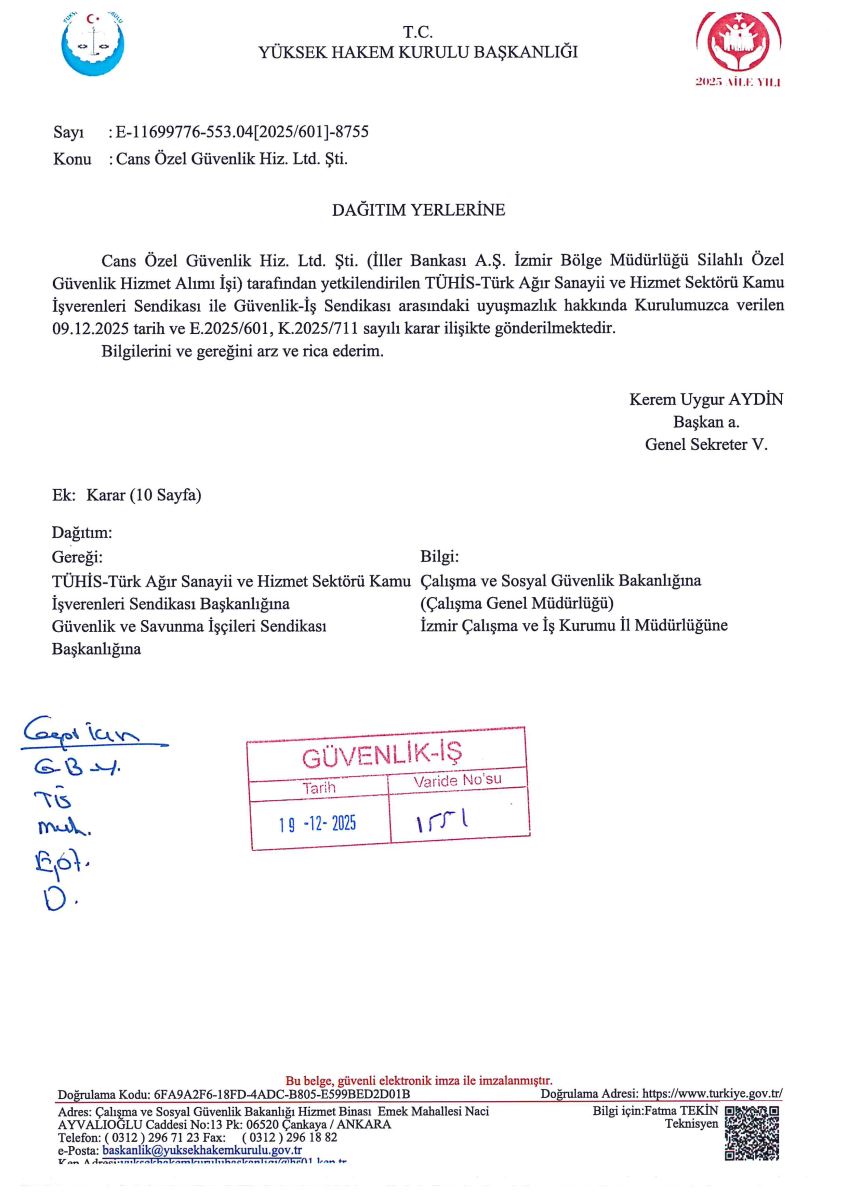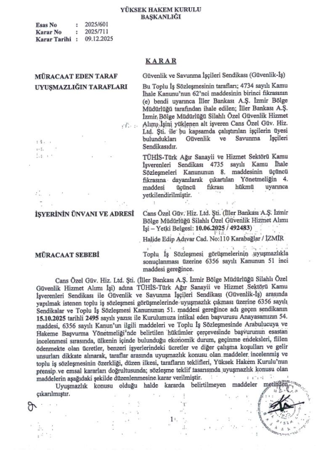 Cans Özel Güvenlik Hiz. Ltd. Şti. (İller Bankası A.Ş. İzmir Bölge Müdürlüğü) ile tarafından yetkilendirilen TÜHİS-Türk Ağır Sanayii ve Hizmet Sektörü Kamu İşverenleri Sendikası ile Güvenlik ve Savunma İşçileri Sendikası (GÜVENLİK-İŞ) arasındaki Toplu İş Sözleşmesi Görüşmeleri Yüksek Hakem Kurulunca Karara Bağlanmıştır.