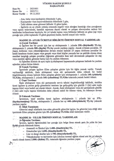 | İşçinin Ana, Baba, Eş ve Çocuklarının Ölümü Halinde | 5.000 TL |