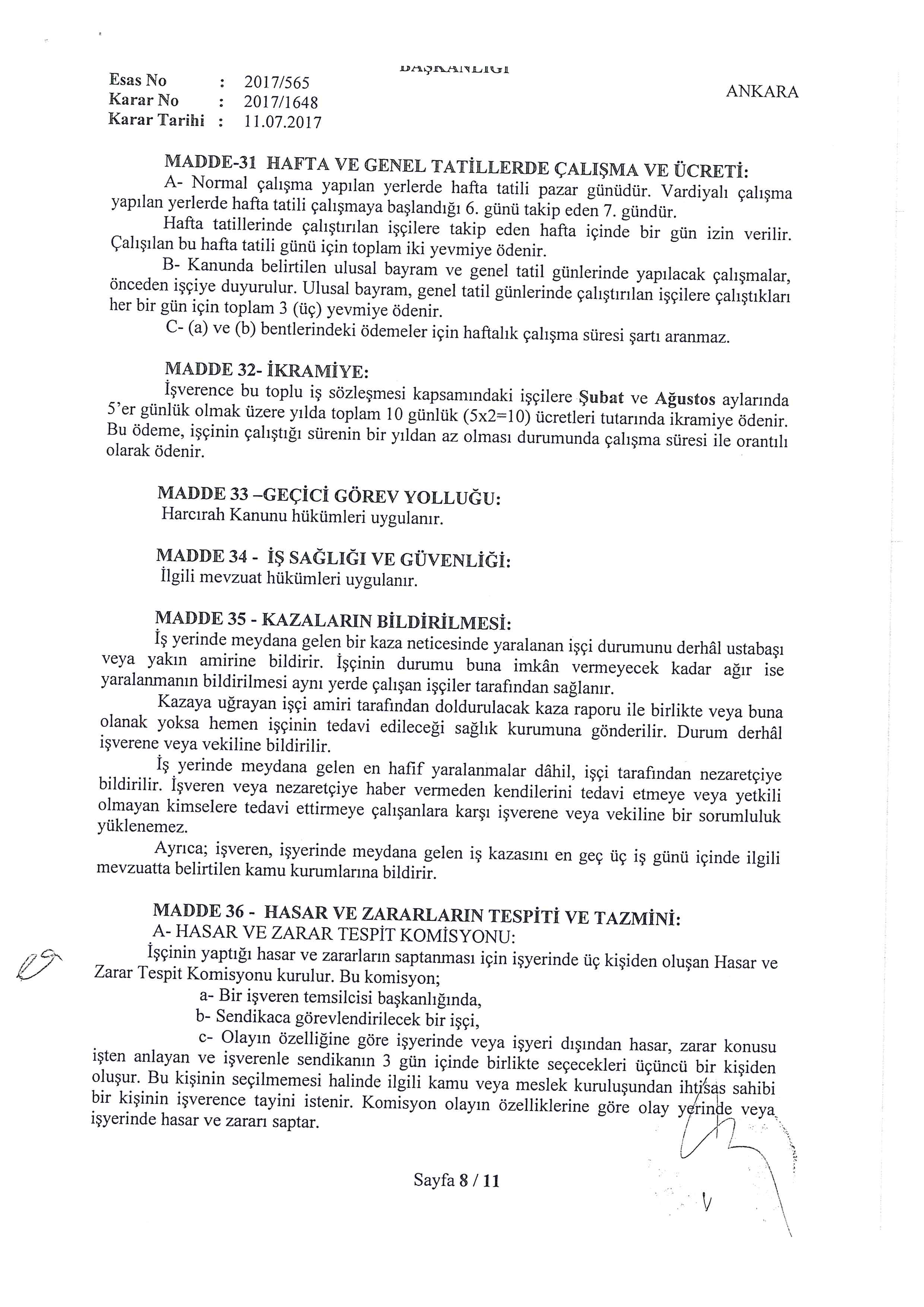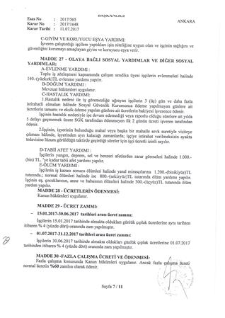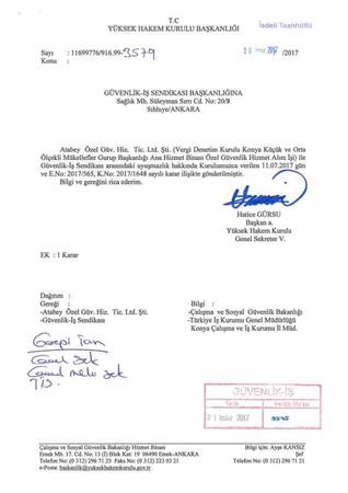Güvenlik ve Savunma İşçileri Sendikası (GÜVENLİK-İŞ)-Vergi Denetim Kurulu Konya Küçük ve Orta Ölçekli Mükellefler Grup Başkanlığı Ana Hizmet Alım İşi – Atabey Özel Güv.Hiz. Tic. Ltd. Şti arasındaki Toplu İş Sözleşme Görüşmeleri Yüksek Hakem Kurulunca Karara Bağlanmıştır. İhale yetki belgesi itibariyle 1 yılın altında olduğu için Toplu Sözleşme Kamu İşverenleri Sendikaları ile imzalanamamış olup, Kurum ve Şirket birlikte sorumludur. 11.07.2017 Gün ve E.2017/565, K.2017/1648 sayılı karar ilişikte gönderilerek toplu iş sözleşmesi imzalanmıştır. Toplu iş sözleşmesi 15.01.2017 – 31.12.2017 tarihleri arasında yürürlükte olacaktır. Türkiye’de özel güvenlik sektöründe ilklerin sendikası olan Güvenlik İş Sendikası olarak üyelerimiz adına imzalanan toplu iş sözleşmesi Vergi Denetim Kurulu Konya Küçük ve Orta Ölçekli Mükellefler Grup Başkanlığı Ana Hizmet Alım İşi – Atabey Özel Güv.Hiz. Tic. Ltd. Şti ‘de çalışan tüm üyelerimize ve özel güvenlik görevlilerine hayırlı olmasını diliyoruz. Toplu iş sözleşmesinde çocuk yardımı, bayram yardımı, ölüm yardımı, evlilik yardımı, silah tazminatı, ikramiye ve maaş ücret zammı belirlendi. Buna göre üyelerimiz… ÜCRET ZAMMI: 15.01.2017-30.06.2017 Tarihleri arası ücret zammı: İşçilerin 15.01.2017 tarihinde almakta oldukları günlük çıplak ücretlerine aynı tarihten itibaren % 4 yüzde dört oranında zam yapılmıştır. 01.07.2017-31.12.2017 Tarihleri arası ücret zammı: İşçilerin 30.06.2017 tarihinde almakta oldukları günlük çıplak ücretlerine 01.07.2017 tarihinden itibaren % 4 yüzde dört oranında zam yapılmıştır. İKRAMİYE: Toplu iş sözleşme kapsamında işçilere İkramiye olarak Şubat ve Ağustos aylarında 5’er günlük olmak üzere toplam 10 günlük (5*2=10), ücretleri tutarında ikramiye ödenir. YEMEK YARDIMI: İhale sözleşmesi veya şartnamesinde yemek yardımı öngörülmediği takdirde, fiilen çalışılan günler için bir öğün yemek verilir. Yemek verilmediği takdirde, karar tarihinden itibaren fiilen çalışılan günler için 5 TL yemek bedeli ödenir. HASTALIK YARDIMI: Hastalık nedeni ile iş göremezliğe uğrayan işçilerin 3(üç) gün ve daha fazla istirahatli olmaları halinde Sosyal Güvenlik Kurumunca ödeme yapılmayan günlere ait ücretlerin tamamı ve eksik ödeme yapılan günlere ait ücretlerin bakiyesi işverence ödenir. İşçinin hastalık nedeniyle işe devam edemediği veya raporlu olduğu sürelere ait yılda 5 defayı geçmemek üzere SGK tarafından ödenmeyen ilk 2 günün ücreti işveren tarafından ödenir. İşçinin, iş yerinin bulunduğu mahal veya başka bir mahalle sevk suretiyle viziteye çıkması halinde iş yerinden ayrı kalacağı zamanlarda; işçiye istirahat verilmeksizin ayakta tedavisine lüzum görüldüğü taktirde geçirdiği süreler için işçi ücretli izinli sayılır. YILLIK ÜCRETLİ İZİNLER Hizmet Süresi; 1 yıldan 5 yıla kadar olanlara 16 gün 5 yıldan fazla 15 yıldan az olanlara 22 gün 15 yıl ve daha fazla olanlara 28 gün