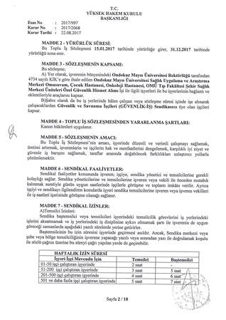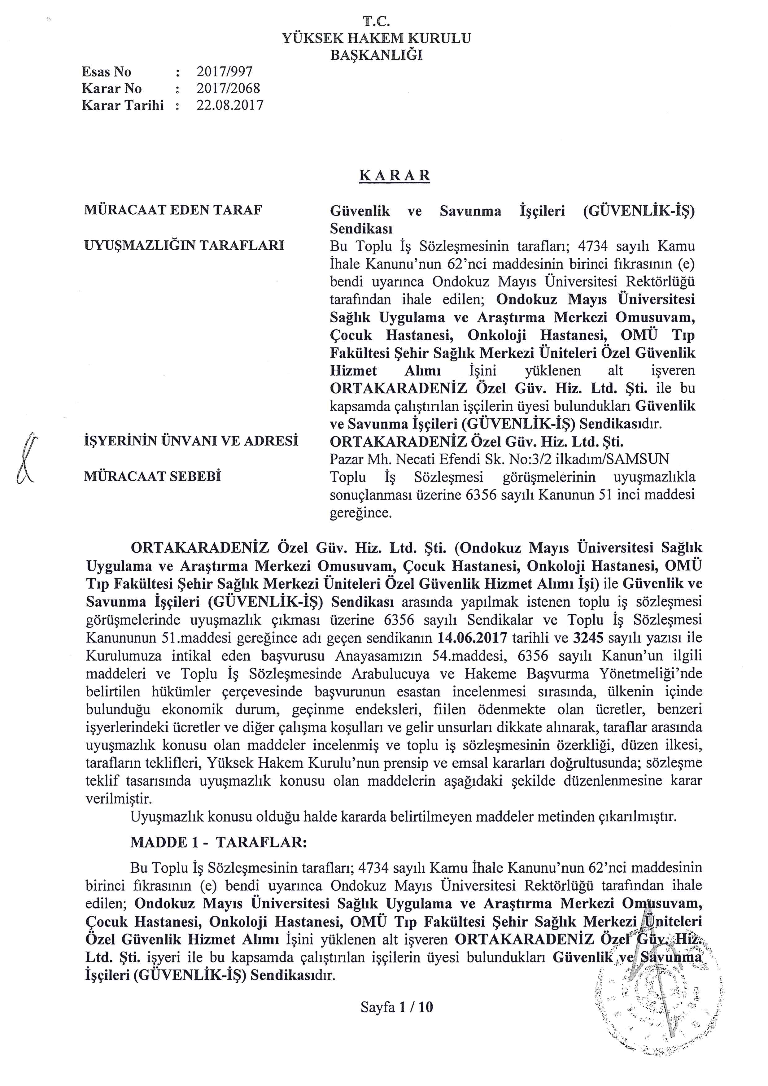 Güvenlik ve Savunma İşçileri Sendikası (GÜVENLİK-İŞ)Ondokuz Mayıs Ünversitesi Sağlık Uygulama ve Araştırma Merkezi Omsuvam, Çocuk Hastanesi, Onkoloji Hastanesi, OMÜ Tıp Fakültesi Şehir Sağlık Merkezi Üniteleri Özel Güvenlik Hizmet AlımıORTAKARADENİZ Özel Güv. Hiz. Ltd.Şti.arasındaki Toplu İş Sözleşmesi Görüşmeleri Yüksek Hakem Kurulunca Karara Bağlanmıştır. İhale yetki belgesi itibariyle 1 yılın altında olduğu için Toplu Sözleşme Kamu İşverenleri Sendikaları ile imzalanamamış olup, Kurum ve Şirket birlikte sorumludur. 22.08.2017 Gün ve E.2017/997, K.2017/2068 sayılı karar ilişikte gönderilerek toplu iş sözleşmesi imzalanmıştır. Toplu iş sözleşmesi 15.01.2017 –31.12.2017 tarihleri arasında yürürlükte olacaktır. Türkiye’de özel güvenlik sektöründe ilklerin sendikası olan Güvenlik İş Sendikası olarak üyelerimiz adına imzalanan toplu iş sözleşmesiOndokuz Mayıs Ünversitesi Sağlık Uygulama ve Araştırma Merkezi Omsuvam, Çocuk Hastanesi, Onkoloji Hastanesi, OMÜ Tıp Fakültesi Şehir Sağlık Merkezi Üniteleri Özel Güvenlik Hizmet Alımı İşiORTAKARADENİZ Özel Güv. Hiz. Ltd.Şti. çalışan tüm üyelerimize ve özel güvenlik görevlilerine hayırlı olmasını diliyoruz. Toplu iş sözleşmesinde çocuk yardımı, bayram yardımı, ölüm yardımı, evlilik yardımı, silah tazminatı, ikramiye ve maaş ücret zammı belirlendi. Buna göre üyelerimiz… ÜCRET ZAMMI: 15.01.2017-30.06.2017 Tarihleri arası ücret zammı: İşçilerin15.01.2017 tarihinde almakta oldukları günlük çıplak ücretlerine aynı tarihten itibaren%4 yüzde Dört oranında zam yapılmıştır. 01.07.2017-31.12.2017 Tarihleri arası ücret zammı: İşçilerin 30.06.2017 tarihinde almakta oldukları günlük çıplak ücretlerine 01.07.2017 tarihinden itibaren % 4 yüzde dört oranında zam yapılmıştır. . İKRAMİYE: Toplu iş sözleşme kapsamında işçilere İkramiye olarak Şubat ve Ağustos aylarında 5’er günlük olmak üzere toplam 10 günlük (5*2=10), ücretleri tutarında ikramiye ödenir. YEMEK YARDIMI: İhale sözleşmesi veya şartnamesinde yemek yardımı öngörülmediği takdirde, fiilen çalışılan günler için bir öğün yemek verilir. Yemek verilmediği takdirde, karar tarihinden itibaren fiilen çalışılan günler için 5 TL yemek bedeli ödenir. HASTALIK YARDIMI: Hastalık nedeni ile iş göremezliğe uğrayan işçilerin 3(üç) gün ve daha fazla istirahatli olmaları halinde Sosyal Güvenlik Kurumunca ödeme yapılmayan günlere ait ücretlerin tamamı ve eksik ödeme yapılan günlere ait ücretlerin bakiyesi işverence ödenir. İşçinin hastalık nedeniyle işe devam edemediği veya raporlu olduğu sürelere ait yılda 5 defayı geçmemek üzere SGK tarafından ödenmeyen ilk 2 günün ücreti işveren tarafından ödenir. İşçinin, iş yerinin bulunduğu mahal veya başka bir mahalle sevk suretiyle viziteye çıkması halinde iş yerinden ayrı kalacağı zamanlarda; işçiye istirahat verilmeksizin ayakta tedavisine lüzum görüldüğü taktirde geçirdiği süreler için işçi ücretli izinli sayılır.