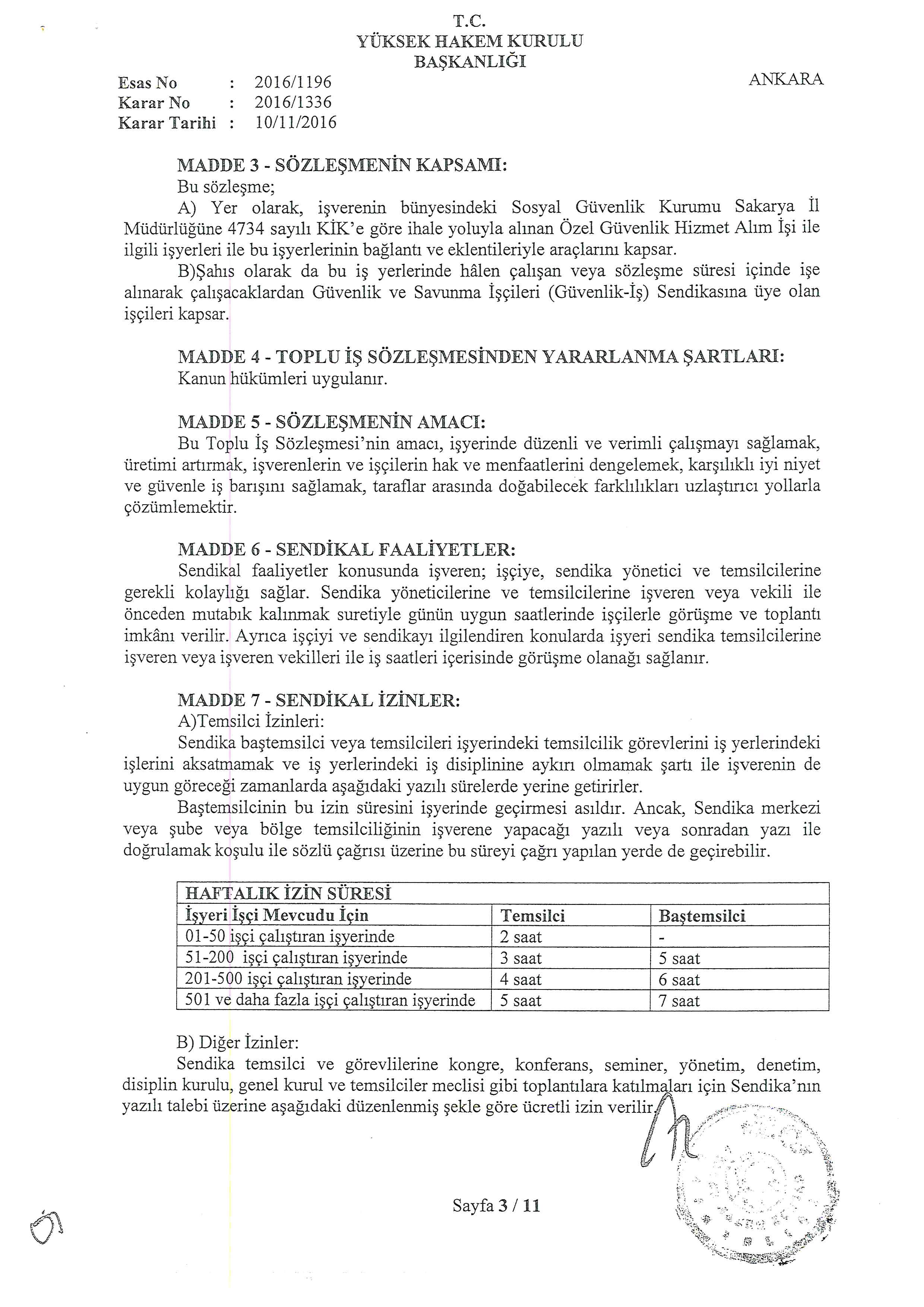 Güvenlik ve Savunma İşçileri Sendikası (GÜVENLİK-İŞ)-Emin Koruma ve Güvenlik Hizmetleri Ltd. Şti. (Sakarya Sosyal Güvenlik Kurumu İl Müdürlüğü Özel Güvenlik Hizmeti Alım İşi) adına KAMU-İŞ Kamu İşletmeleri İşverenleri Sendikası arasındaki Toplu İş Sözleşme Görüşmeleri Yüksek Hakem Kurulunca Karara Bağlanmıştır. 10.11.2016 Gün ve E.2016/1196, K.2016/1336 sayılı karar ilişikte gönderilerek toplu iş sözleşmesi imzalanmıştır. Toplu iş sözleşmesi 01.04.2016 – 31.03.2018 tarihleri arasında yürürlükte olacaktır. Türkiye’de özel güvenlik sektöründe ilklerin sendikası olan Güvenlik İş Sendikası olarak üyelerimiz adına imzalanan toplu iş sözleşmesi Sakarya Sosyal Güvenlik Kurumu İl Müdürlüğü Özel Güvenlik Hizmeti Alım İşi –Emin Koruma ve Güvenlik Hizmetleri Ltd. Şti.’de çalışan tüm üyelerimize ve özel güvenlik görevlilerine hayırlı olmasını diliyoruz. Toplu iş sözleşmesinde çocuk yardımı, bayram yardımı, ölüm yardımı, evlilik yardımı, silah tazminatı, ikramiye ve maaş ücret zammı belirlendi. Buna göre üyelerimiz… ÜCRET ZAMMI: 01.04.2016-31.12.2016 Tarihleri arası ücret zammı: İşçilerin 01.04.2016 tarihinde almakta oldukları günlük çıplak ücretlerine aynı tarihten itibaren % 1 yüzde bir oranında zam yapılmıştır. 01.01.2017-30.06.2017 Tarihleri arası ücret zammı: İşçilerin 01.01.2017 tarihinde almakta oldukları günlük çıplak ücretlerine aynı tarihten itibaren % 4 yüzde dört oranında zam yapılmıştır. 01.07.2017-31.12.2017 Tarihleri arası ücret zammı: İşçilerin 30.06.2017 tarihinde almakta oldukları günlük çıplak ücretlerine 01.07.2017 tarihinden itibaren % 4 yüzde dört oranında zam yapılmıştır. 01.01.2018-31.03.2018 Tarihleri arası ücret zammı: İşçilerin 01.01.2018 tarihinde almakta oldukları günlük çıplak ücretlerine aynı tarihten itibaren % 3 yüzde üç oranında zam yapılmıştır. İKRAMİYE: Toplu iş sözleşme kapsamında işçilere İkramiye olarak Mayıs ve Kasım aylarında 5’er günlük olmak üzere toplam 10 günlük (5*2=10), ücretleri tutarında ikramiye ödenir. YEMEK YARDIMI: İhale sözleşmesi veya şartnamesinde yemek yardımı öngörülmediği takdirde, fiilen çalışılan günler için bir öğün yemek verilir. Yemek verilmediği takdirde, karar tarihinden itibaren fiilen çalışılan günler için 5 TL yemek bedeli ödenir. HASTALIK YARDIMI: Hastalık nedeni ile iş göremezliğe uğrayan işçilerin 3(üç) gün ve daha fazla istirahatli olmaları halinde Sosyal Güvenlik Kurumunca ödeme yapılmayan günlere ait ücretlerin tamamı ve eksik ödeme yapılan günlere ait ücretlerin bakiyesi işverence ödenir. İşçinin hastalık nedeniyle işe devam edemediği veya raporlu olduğu sürelere ait yılda 5 defayı geçmemek üzere SGK tarafından ödenmeyen ilk 2 günün ücreti işveren tarafından ödenir. İşçinin, iş yerinin bulunduğu mahal veya başka bir mahalle sevk suretiyle viziteye çıkması halinde iş yerinden ayrı kalacağı zamanlarda; işçiye istirahat verilmeksizin ayakta tedavisine lüzum görüldüğü taktirde geçirdiği süreler için işçi ücretli izinli sayılır. YILLIK ÜCRETLİ İZİNLER Hizmet Süresi; 1 yıldan 5 yıla kadar olanlara 16 gün 5 yıldan fazla 15 yıldan az olanlara 22 gün 15 yıl ve daha fazla olanlara 28 gün