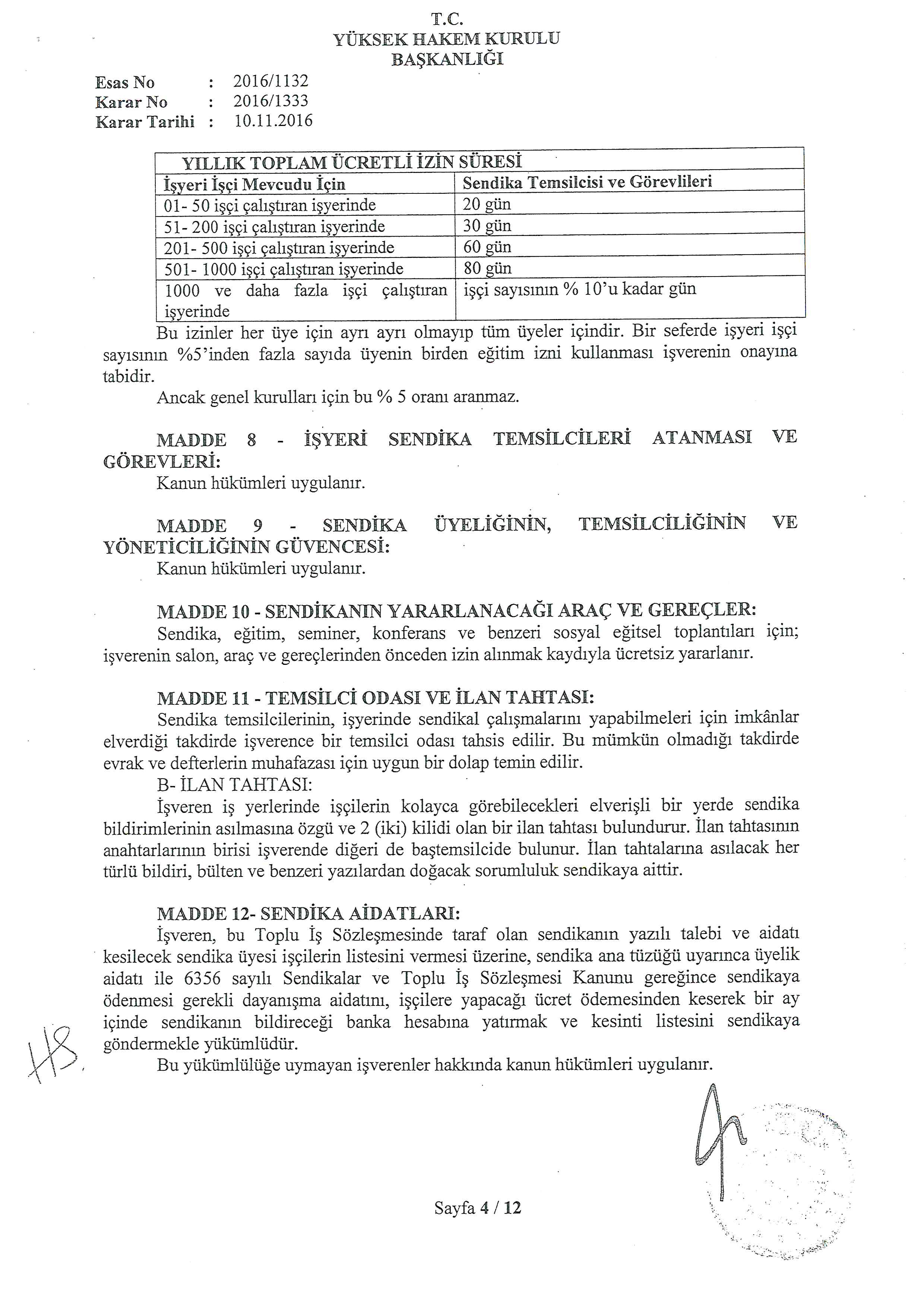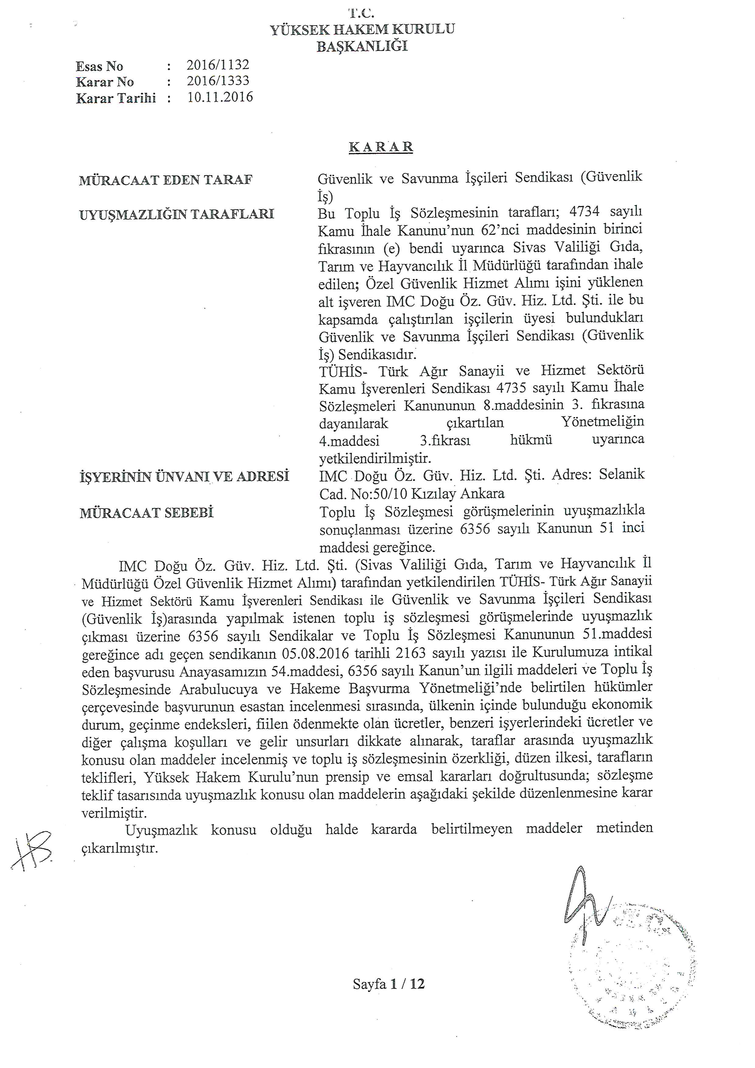 Güvenlik ve Savunma İşçileri Sendikası (GÜVENLİK-İŞ)-IMC Doğu Özel Güvenlik Hizmetleri Ltd. Şti. (Sivas Valiliği Gıda, Tarım ve Hayvancılık İl Müdürlüğü Özel Güvenlik Hizmeti Alımı) adına TÜHİS Türk Ağır Sanayii ve Hizmet Sektörü Kamu İşletmeleri İşverenleri Sendikası arasındaki Toplu İş Sözleşme Görüşmeleri Yüksek Hakem Kurulunca Karara Bağlanmıştır. 10.11.2016 Gün ve E.2016/1132, K.2016/1333 sayılı karar ilişikte gönderilerek toplu iş sözleşmesi imzalanmıştır. Toplu iş sözleşmesi 01.03.2016 – 31.12.2017 tarihleri arasında yürürlükte olacaktır. Türkiye’de özel güvenlik sektöründe ilklerin sendikası olan Güvenlik İş Sendikası olarak üyelerimiz adına imzalanan toplu iş sözleşmesi Sivas Valiliği Gıda, Tarım ve Hayvancılık İl Müdürlüğü Özel Güvenlik Hizmeti Alımı–IMC Doğu Özel Güvenlik Hizmetleri Ltd. Şti.’de çalışan tüm üyelerimize ve özel güvenlik görevlilerine hayırlı olmasını diliyoruz. Toplu iş sözleşmesinde çocuk yardımı, bayram yardımı, ölüm yardımı, evlilik yardımı, silah tazminatı, ikramiye ve maaş ücret zammı belirlendi. Buna göre üyelerimiz… ÜCRET ZAMMI: 01.03.2016-31.12.2016 Tarihleri arası ücret zammı: İşçilerin 01.03.2016 tarihinde almakta oldukları günlük çıplak ücretlerine aynı tarihten itibaren % 1 yüzde bir oranında zam yapılmıştır. 01.01.2017-30.06.2017 Tarihleri arası ücret zammı: İşçilerin 01.01.2017 tarihinde almakta oldukları günlük çıplak ücretlerine aynı tarihten itibaren % 4 yüzde dört oranında zam yapılmıştır. 01.07.2017-31.12.2017 Tarihleri arası ücret zammı: İşçilerin 30.06.2017 tarihinde almakta oldukları günlük çıplak ücretlerine 01.07.2017 tarihinden itibaren % 4 yüzde dört oranında zam yapılmıştır. İKRAMİYE: Toplu iş sözleşme kapsamında işçilere İkramiye olarak Nisan ve Ekim aylarında 5’er günlük olmak üzere toplam 10 günlük (5*2=10), ücretleri tutarında ikramiye ödenir. YEMEK YARDIMI: İhale sözleşmesi veya şartnamesinde yemek yardımı öngörülmediği takdirde, fiilen çalışılan günler için bir öğün yemek verilir. Yemek verilmediği takdirde, karar tarihinden itibaren fiilen çalışılan günler için 5 TL yemek bedeli ödenir. HASTALIK YARDIMI: Hastalık nedeni ile iş göremezliğe uğrayan işçilerin 3(üç) gün ve daha fazla istirahatli olmaları halinde Sosyal Güvenlik Kurumunca ödeme yapılmayan günlere ait ücretlerin tamamı ve eksik ödeme yapılan günlere ait ücretlerin bakiyesi işverence ödenir. İşçinin hastalık nedeniyle işe devam edemediği veya raporlu olduğu sürelere ait yılda 5 defayı geçmemek üzere SGK tarafından ödenmeyen ilk 2 günün ücreti işveren tarafından ödenir. İşçinin, iş yerinin bulunduğu mahal veya başka bir mahalle sevk suretiyle viziteye çıkması halinde iş yerinden ayrı kalacağı zamanlarda; işçiye istirahat verilmeksizin ayakta tedavisine lüzum görüldüğü taktirde geçirdiği süreler için işçi ücretli izinli sayılır. YILLIK ÜCRETLİ İZİNLER Hizmet Süresi; 1 yıldan 5 yıla kadar olanlara 16 gün 5 yıldan fazla 15 yıldan az olanlara 22 gün 15 yıl ve daha fazla olanlara 28 gün