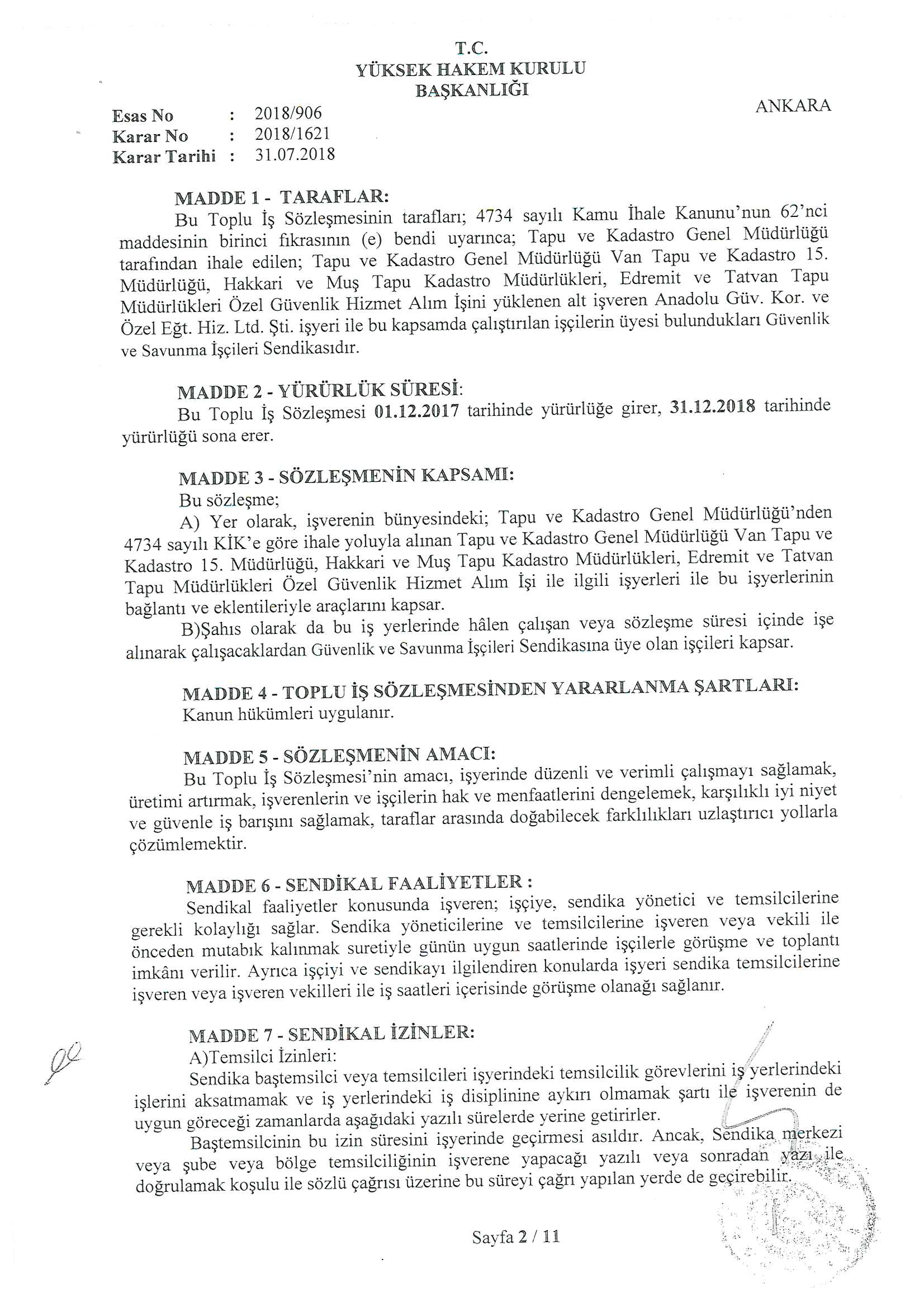 Anadolu Güv. Kor. ve Özel Eğt. Hiz. Ltd. Şti. (Tapu ve Kadastro Genel Müdürlüğü Van Tapu ve Kadastro 15. Müdürlüğü, Hakkari ve Muş Tapu ve Kadastro Müdürlükleri,Edremit ve Tatvan Tapu Müdürlükleri Özel Güvenlik Hizmet Alımı İşi) ile Güvenlik ve Savunma İşçileri Sendikası (GÜVENLİK-İŞ) – arasındaki Toplu İş Sözleşmesi Görüşmeleri Yüksek Hakem Kurulunca Karara Bağlanmıştır.