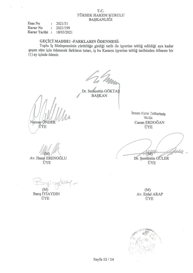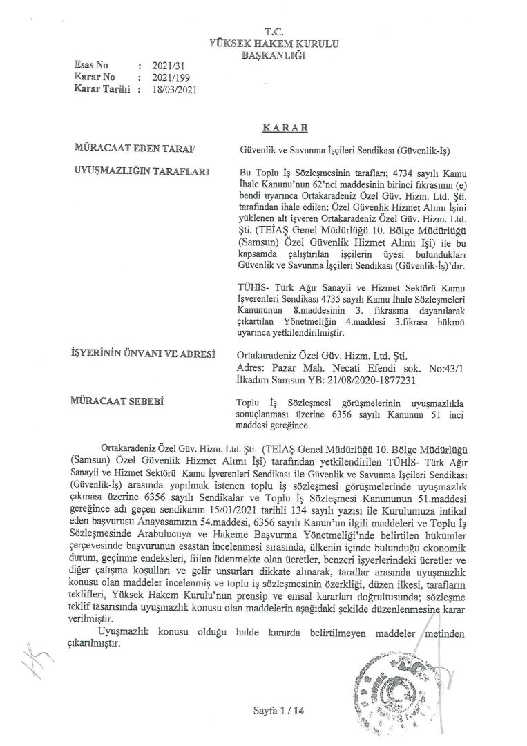 Ortakaradeniz Özel Güv. Hiz. Ltd. Şti. (TEİAŞ Genel Müdürlüğü 10. Bölge Müdürlüğü (Samsun)) tarafından yetkilendirilen TÜHİS-Türk Ağır Sanayii ve Hizmet Sektörü Kamu İşverenleri Sendikası ile Güvenlik ve Savunma İşçileri Sendikası (GÜVENLİK-İŞ) – arasındaki Toplu İş Sözleşmesi Görüşmeleri Yüksek Hakem Kurulunca Karara Bağlanmıştır.