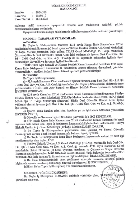 Şark Özel Güv. Ltd. Şti.-CMG Özel Güv. ve Kor. A.Ş. Ortaklığı (TEİAŞ Genel Müdürlüğü 15. Bölge Müdürlüğü (Erzurum)) ile tarafından yetkilendirilen TÜHİS-Türk Ağır Sanayii ve Hizmet Sektörü Kamu İşverenleri Sendikası ile Güvenlik ve Savunma İşçileri Sendikası (GÜVENLİK-İŞ) arasındaki Toplu İş Sözleşmesi Görüşmeleri Yüksek Hakem Kurulunca Karara Bağlanmıştır.