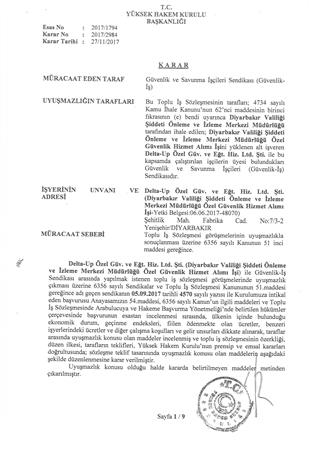 Güvenlik ve Savunma İşçileri Sendikası (GÜVENLİK-İŞ) – DGS Özel Güvenlik Koruma ve Eğitim. Hiz. San. ve Tic. Ltd. Şti. (Diyarbakır İl Kültür ve Turizm Müdürlüğü Özel Güvenlik Hizmet Alımı İşi) adına KAMU-İŞ Kamu İşletmeleri İşverenleri Sendikası arasındaki Toplu İş Sözleşme Görüşmeleri Yüksek Hakem Kurulunca Karara Bağlanmıştır.