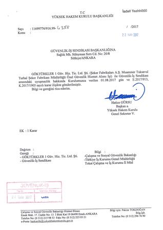 Detaylı BilgiGüvenlik ve Savunma İşçileri Sendikası (GÜVENLİK-İŞ)Nuri Şeker Uşak şeker Fabrikası Özel Güvenlik Hizmet AlımıYÖNDEMLİ Özel Güv.Koruma. ve Güv.Eğt. Hiz.Ltd.Şti.arasındaki Toplu İş Sözleşmesi Görüşmeleri Yüksek Hakem Kurulunca Karara Bağlanmıştır.