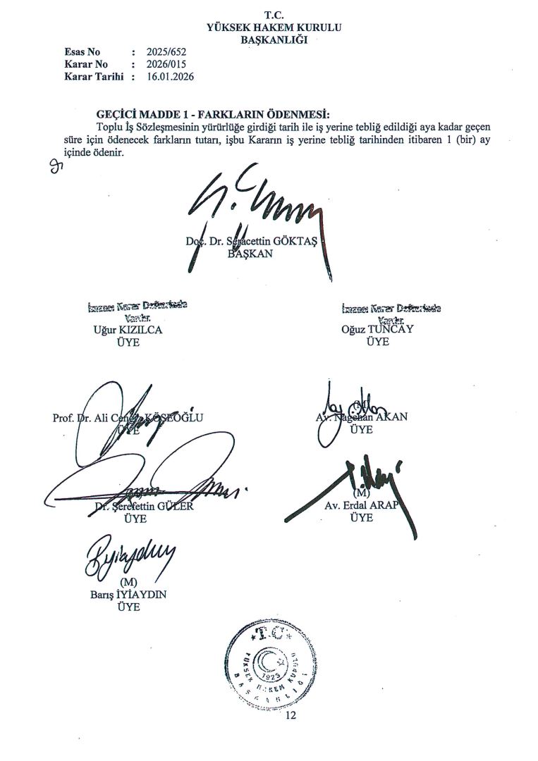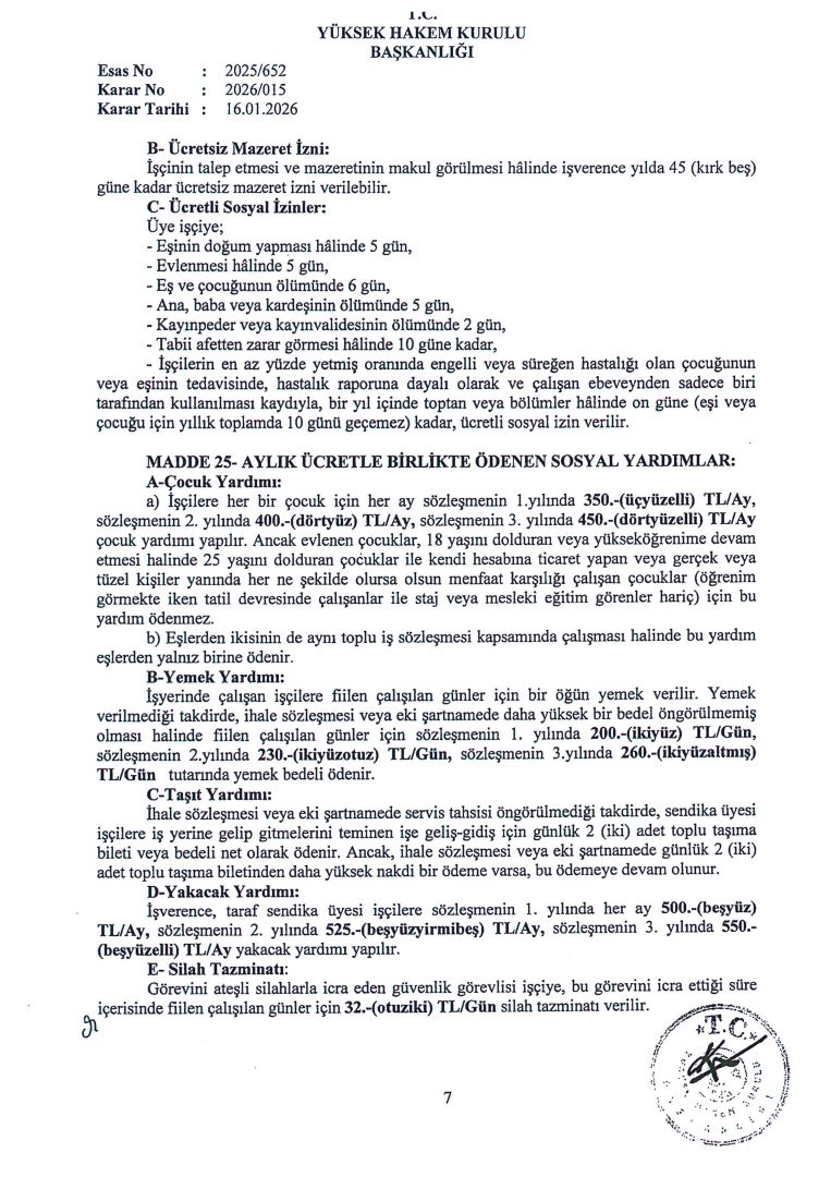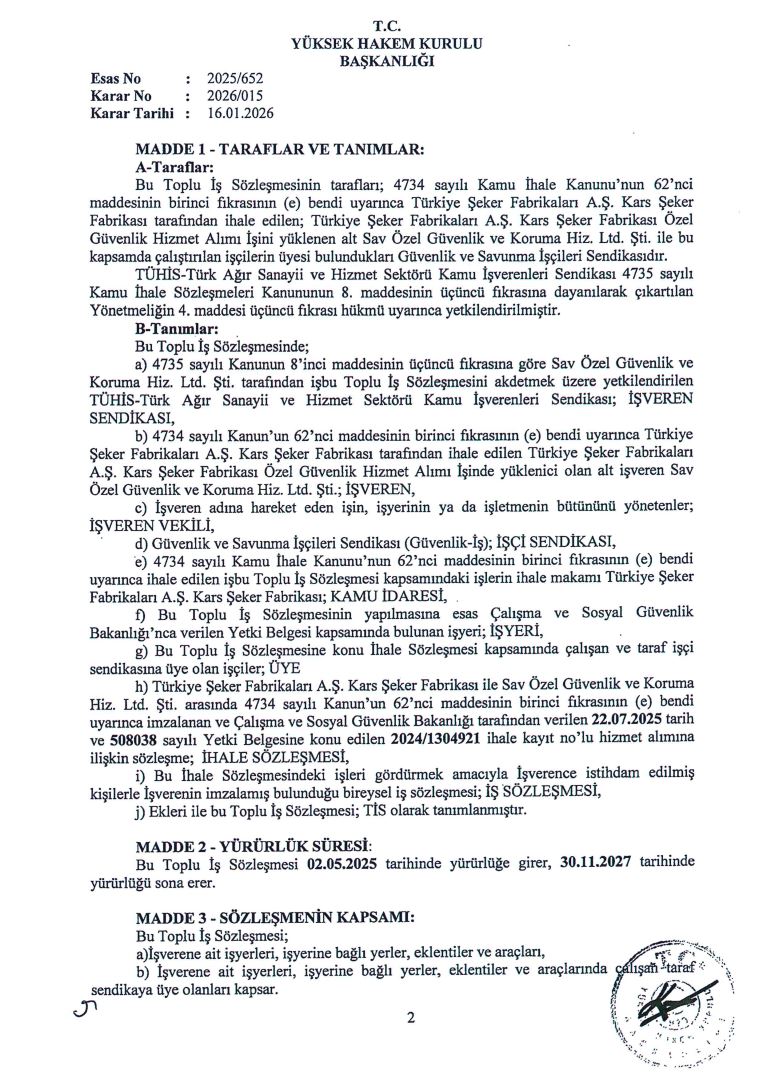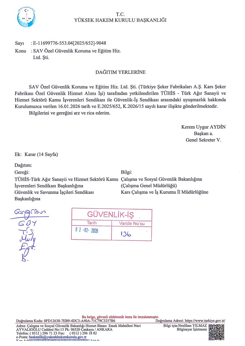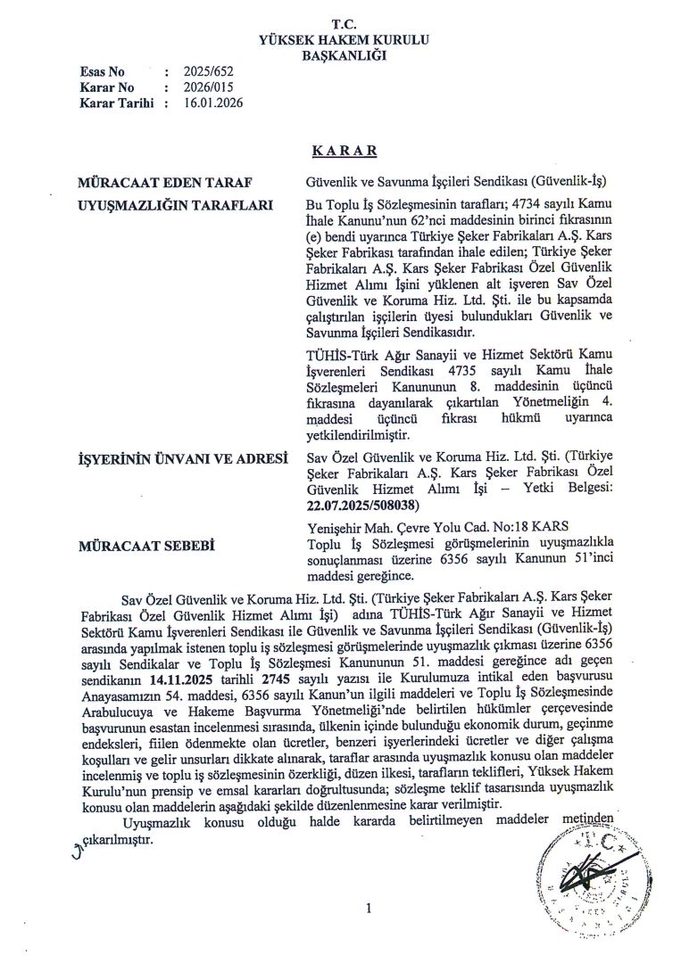 SAV Özel Güvenlik Koruma ve Eğitim Hiz. Ltd. Şti. (Türkiye Şeker Fabrikaları A.Ş. Kars Şeker Fabrikası) ile tarafından yetkilendirilen TÜHİS-Türk Ağır Sanayii ve Hizmet Sektörü Kamu İşverenleri Sendikası ile Güvenlik ve Savunma İşçileri Sendikası (GÜVENLİK-İŞ) arasındaki Toplu İş Sözleşmesi Görüşmeleri Yüksek Hakem Kurulunca Karara Bağlanmıştır.